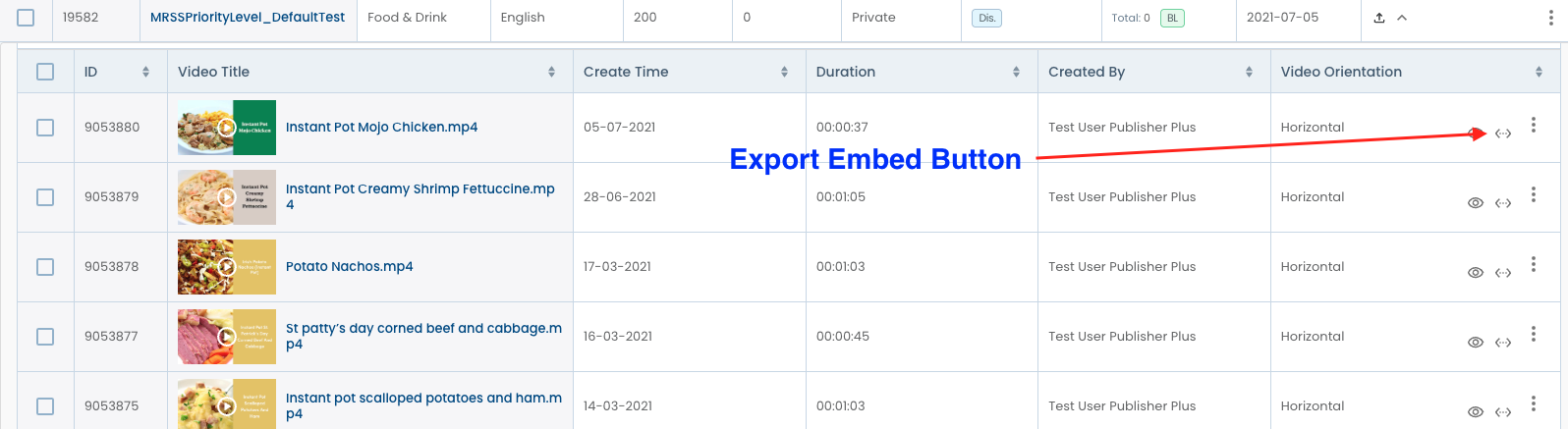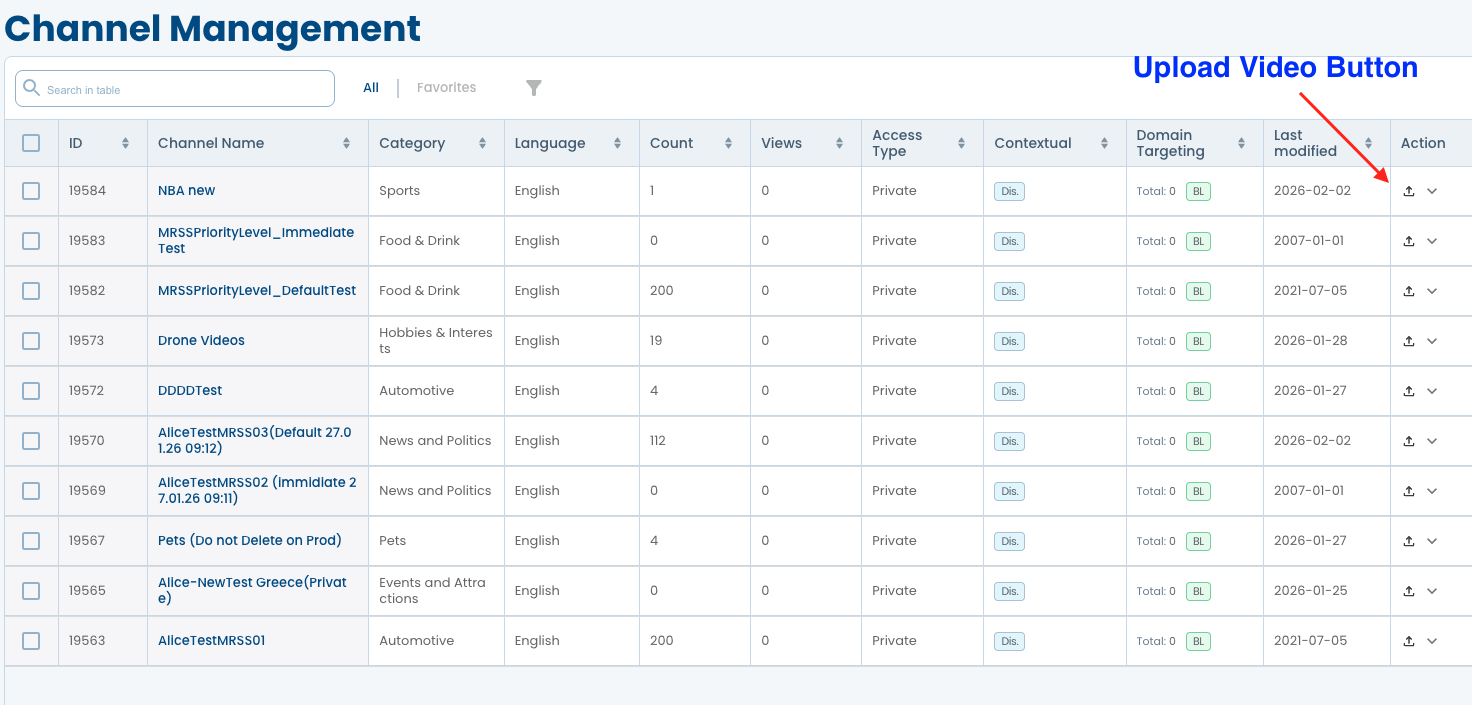 - Click the Arrow button to expand the channels view and open the Video table with all videos inside the channel