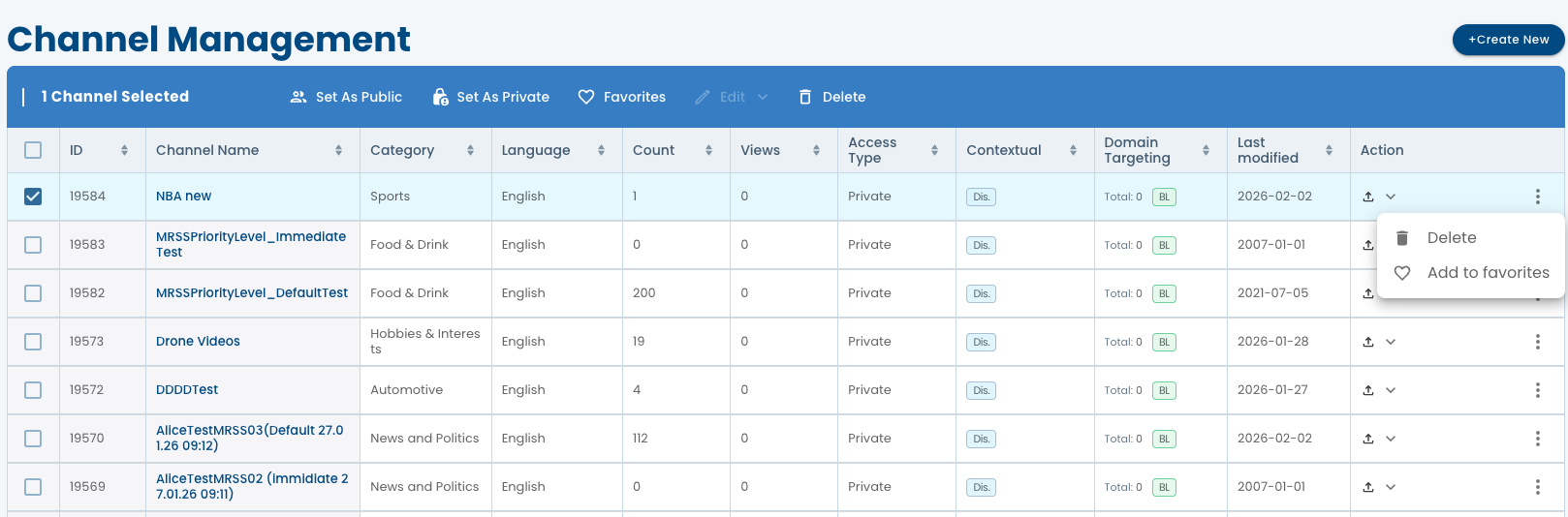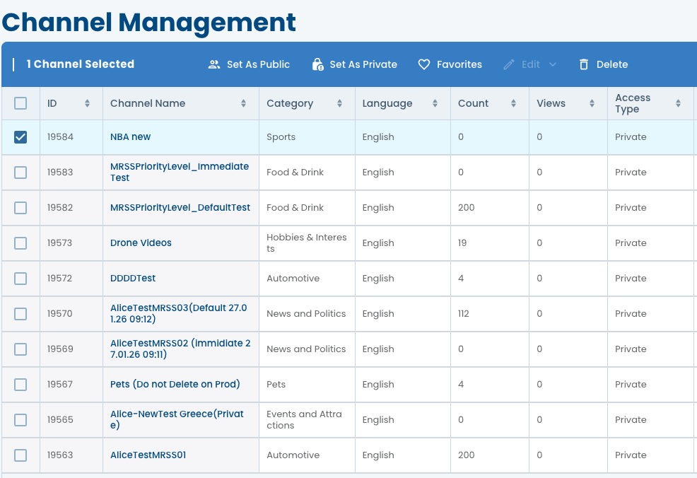- You can further edit the channel, delete the channel, or in the Actions Bar by selecting the channel check box or by click on channels name.